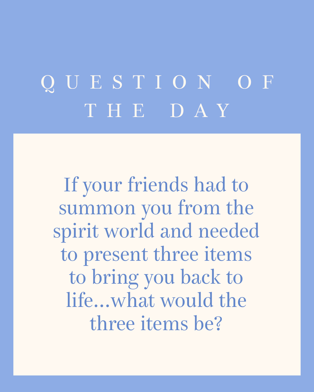 If your friends had to summon you from the spirit world and needed to present three items to bring you back to life… what would the three items be?